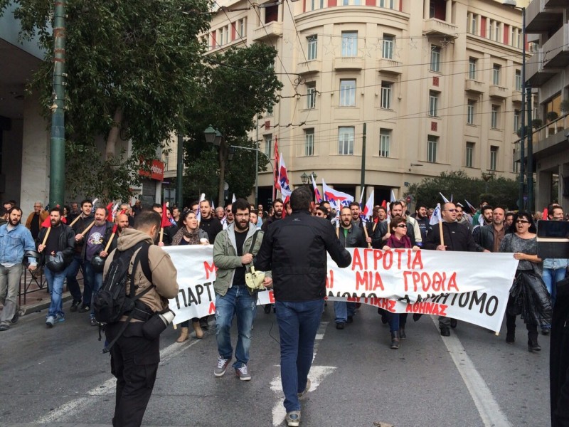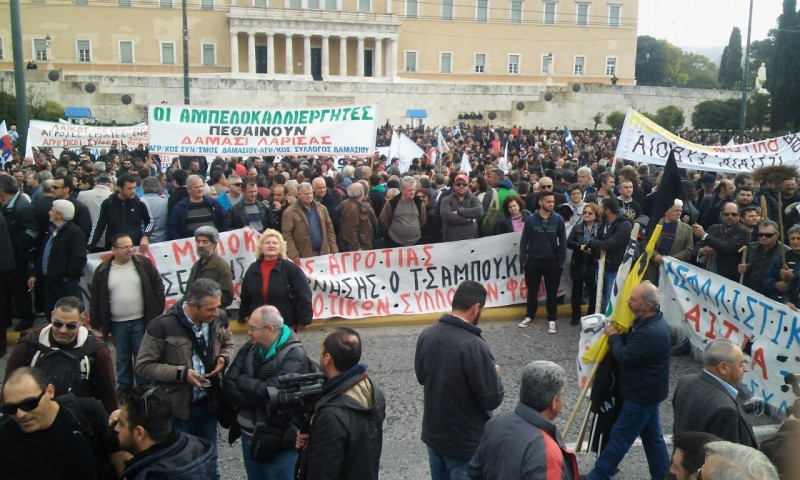 Στο Σύνταγμα μπροστά από τη Βουλή φτάνοντας η πορεία του ΠΑΜΕ συναντήθηκε με τα μπλόκα των αγροτών που βρίσκονται συγκεντρωμένοι έχοντας στήσει από χθες σκηνές στην πλατεία Συντάγματος.
