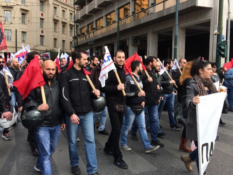 Στην κινητοποίηση συμπαράστασης του ΠΑΜΕ συμμετέχουν εργαζόμενοι από όλους τους κλάδους και οργανώσεις συνταξιούχων. Το αίτημα που κυριάρχησε στην πορεία του ήταν η απόσυρση του νομοσχεδίου για το ασφαλιστικό που «σφαγιάζει τον κοινωνικό χαρακτήρα της ασφάλισης».
