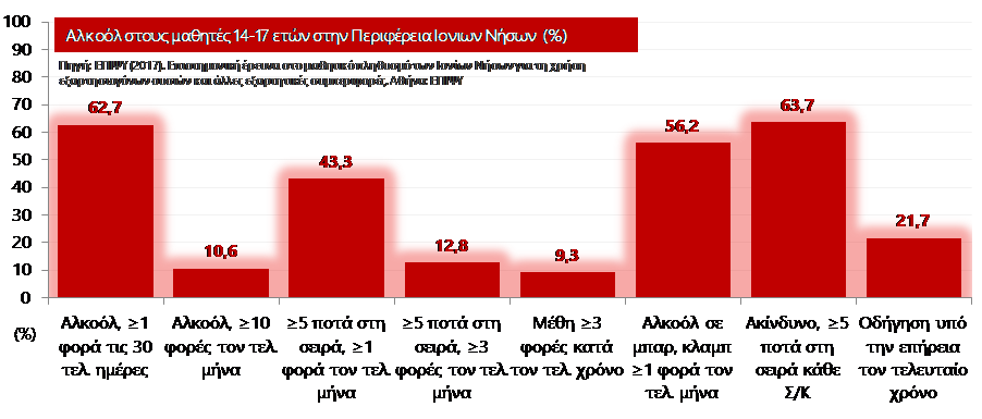 - Ένας στους 9 (11%, κυρίως αγόρια) κατανάλωσε αλκοόλ ≥10 φορές τον τελευταίο μήνα.