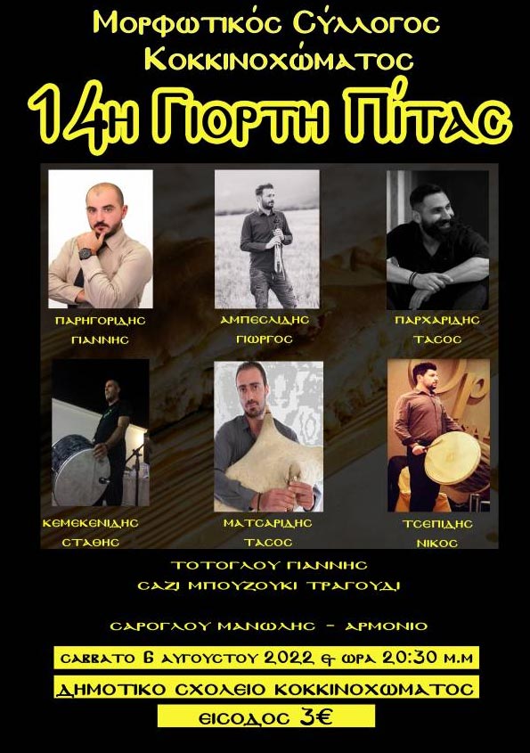 Ο Μορφωτικός Σύλλογος Κοκκινοχώματος σας προσκαλεί το Σάββατο 6 Αυγούστου 2022 και ώρα 20:30 μ.μ. στο Δημοτικό Σχολείο Κοκκινοχώματος στην 14η Γιορτή Πίτας για ένα μεγάλο λαϊκό-ποντιακό γλέντι.