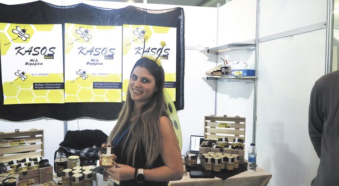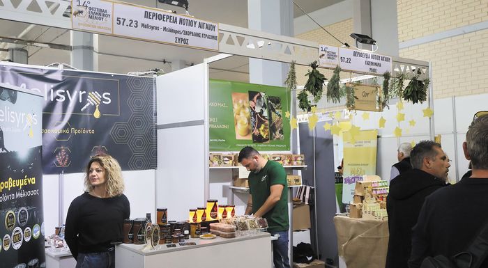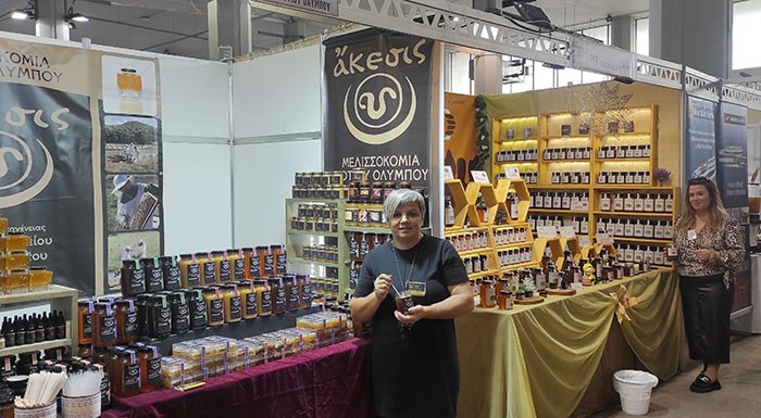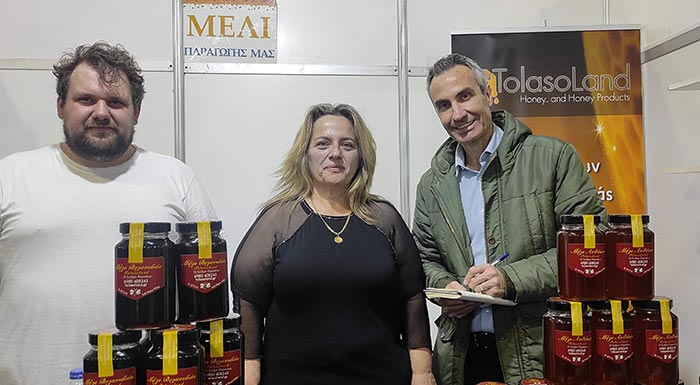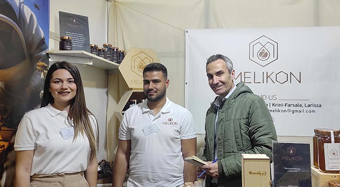 ✱ Στο διπλανό περίπτερο συναντήσαμε, επίσης από την επαρχία Φαρσάλων, δύο νέα παιδιά που ακολούθησαν το επάγγελμα του πατέρα τους. Η Κατερίνα Σιούτογλου και ο Βάιος Ζάντζας, με την εταιρεία Melikon (με έδρα την Κρήνη Φαρσάλων), προωθούν μέλι που παράγουν από τις κυψέλες που τοποθετούν σε Θάσο (πεύκο), Φωκίδα (έλατο), Γαλαξίδι (θυμάρι), ενώ μετακινούνται μέχρι και στην Πελοπόννησο.