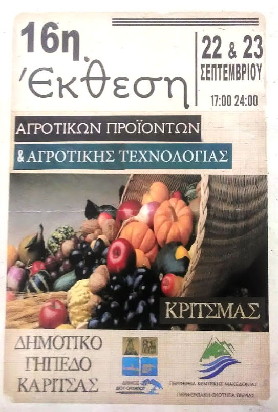 Η φετινή 16η Έκθεση Αγροτικών Προϊόντων, Αγροτικής Τεχνολογίας και Οικοτεχνίας (Γιορτή του Αγρότη – Κριταμά), θα πραγματοποιηθεί στις 22 & 23 Σεπτεμβρίου 2018, στο Δημοτικό Γήπεδο Καρίτσας Πιερίας με συνδιοργανωτές, τον Δήμο Δίου-Ολύμπου και την Περιφερειακή Ενότητα Πιερίας με την συνεργασία των συλλογικών φορέων και πολιτών της περιοχής.