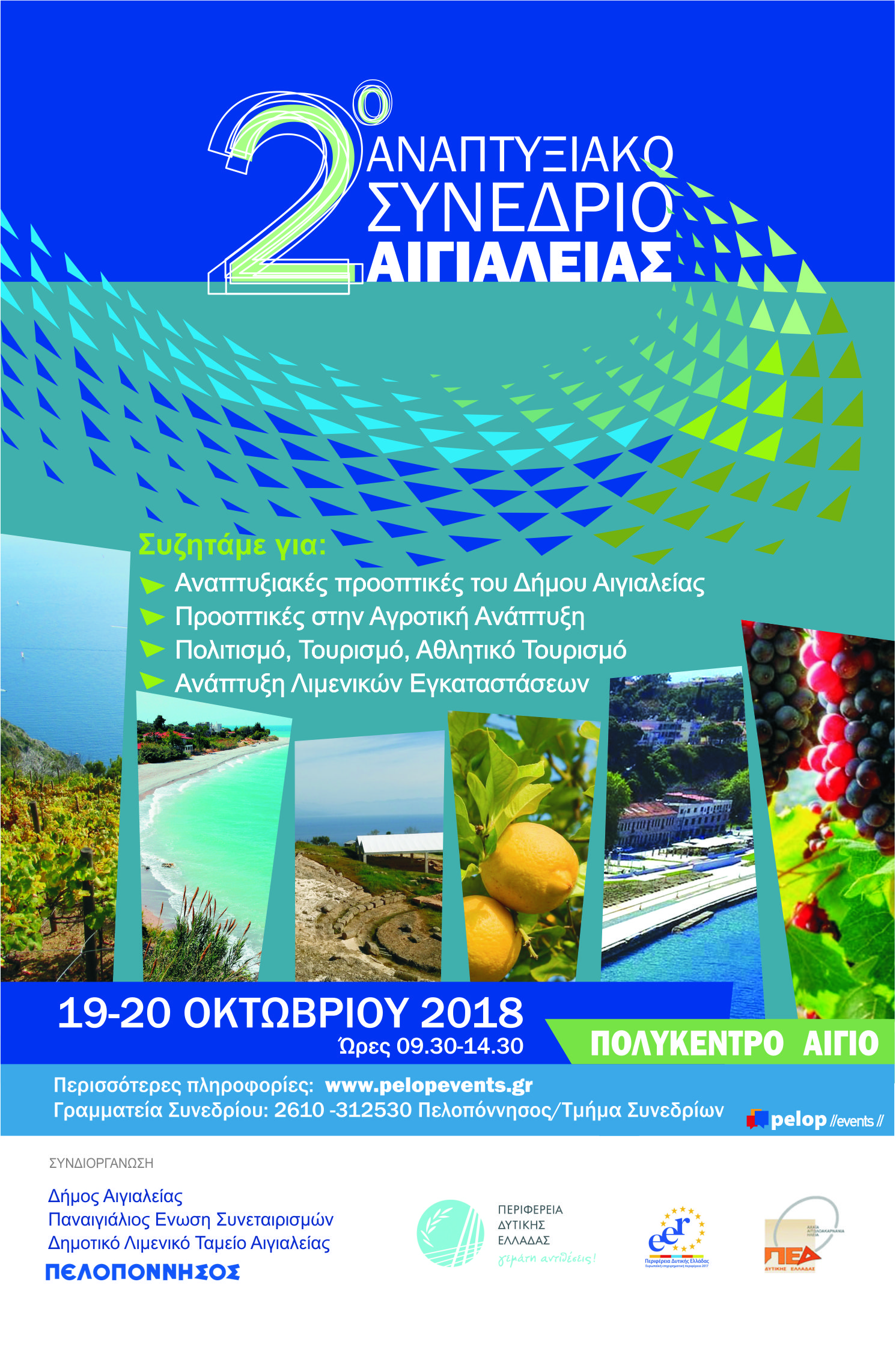 Καίρια ζητήματα ανάπτυξης θα απασχολήσουν τις εργασίες του 2ου Αναπτυξιακού Συνεδρίου Αιγιαλείας που θα πραγματοποιηθεί στις 19 και 20 Οκτωβρίου στο Αίγιο, σε συνδιοργάνωση του Δήμου Αιγιαλείας, της Παναιγιαλείου Ένωσης Συνεταιρισμών και της εφημερίδας ΠΕΛΟΠΟΝΝΗΣΟΣ, της Περιφέρειας Δυτικής Ελλάδας και της Περιφερειακής Ένωσης Δήμων Δυτικής Ελλάδος, υπουργεία και πλειάδα θεσμικών και παραγωγικών φορέων.