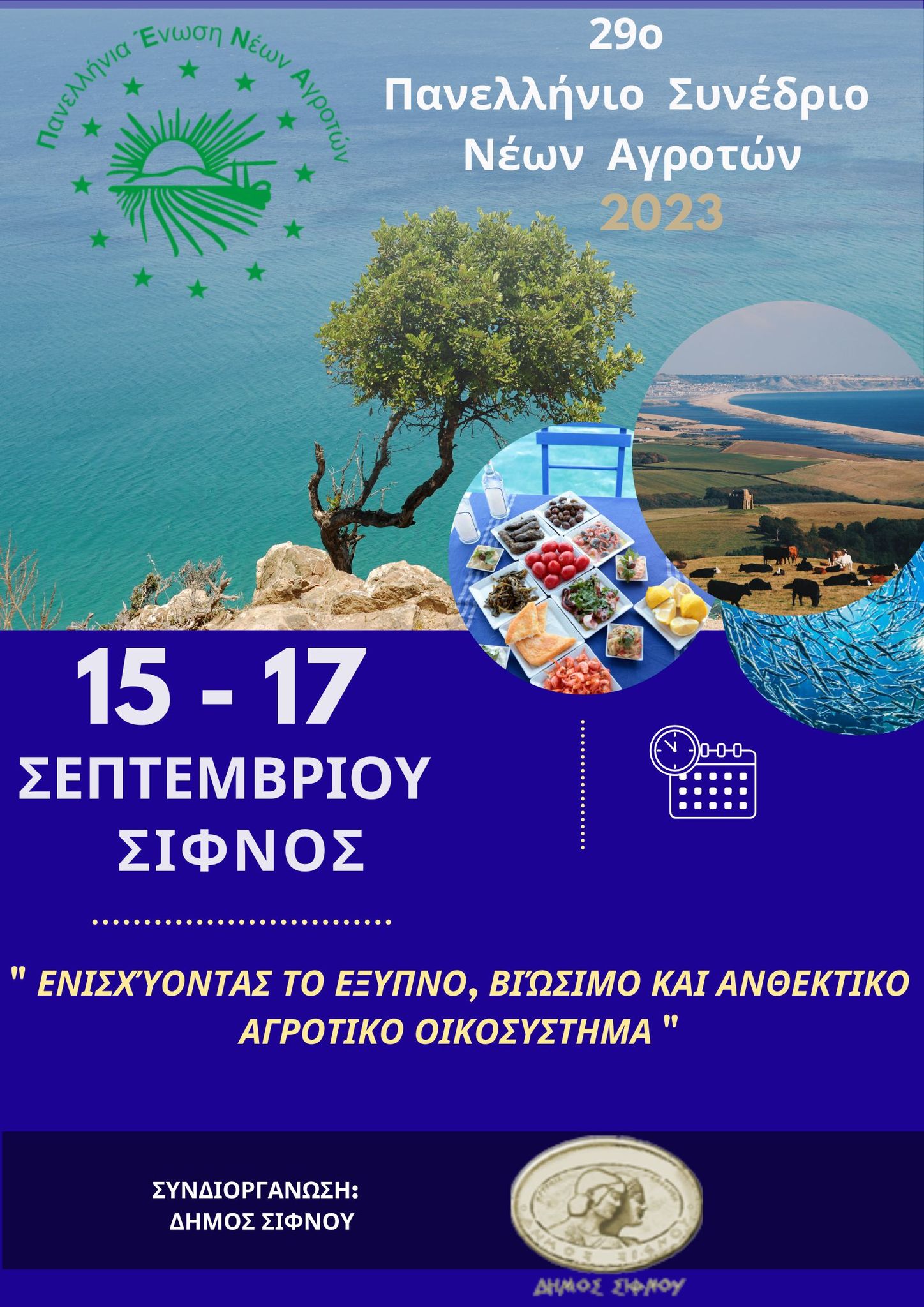 Όπως κάθε χρόνο, εδώ και 30 περίπου χρόνια, η Πανελλήνια Ένωση Νέων Αγροτών διοργανώνει σε ξεχωριστές περιοχές της χώρας το ετήσιο συνέδριό της, με στόχο η Ένωση να έρθει σε επαφή με τις τοπικές κοινωνίες, να αφουγκραστεί τον παλμό των νέων αγροτών και να συνομιλήσει με τους τοπικούς φορείς, ώστε να εξειδικεύσει τις προτάσεις της για την αγροτική ανάπτυξη. Με ειδικούς επιστήμονες του χώρου και εξειδικευμένους συνεργάτες, μεταφέρει τις προτάσεις και τους προβληματισμούς της για έναν γόνιμο διάλογο. Το συνέδριο θα διεξαχθεί στο νησί της Σίφνου από τις 15 έως και τις 17 Σεπτεμβρίου, με τη συμμετοχή νέων αγροτών από όλη την Ελλάδα.