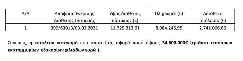 Από το παραπάνω ποσό των 37.341.066,66€ ποσό ύψους 2.741.066,66€ (δύο εκατομμυρίων επτακοσίων σαράντα μια χιλιάδων εξήντα έξι ευρώ και εξήντα έξι λεπτών) αφορά αδιάθετα υπόλοιπα της αριθ.399/63013/03.03.2021 (ΑΔΑ: 9ΓΔΠ4653ΠΓ-Β0Γ) Απόφασης Έγκρισης Διάθεσης Πίστωσης, σύμφωνα με τον ακόλουθο πίνακα: