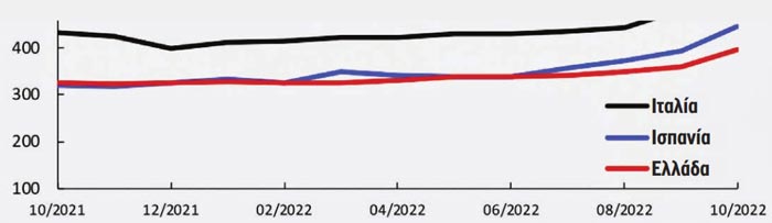 Στην Ελλάδα, καταγράφηκε τιμή παραγωγού 3,97 ευρώ/κιλό, με μηνιαία αύξηση 10% και ετήσια αύξηση (Οκτώβριος 2021 – Οκτώβριος 2022) κατά 22%. Αντίστοιχα, στην Ιταλία η τιμή παραγωγού τον φετινό Οκτώβριο διαμορφώθηκε σε 5,30 ευρώ/κιλό με μηνιαία αύξηση επίσης 10% και ετήσια 23%. Στην Ισπανία, η τιμή παραγωγού φέτος τον Οκτώβριο διαμορφώθηκε στα 4,46 ευρώ/κιλό, με μηνιαία αύξηση 13% και ετήσια 39%.
