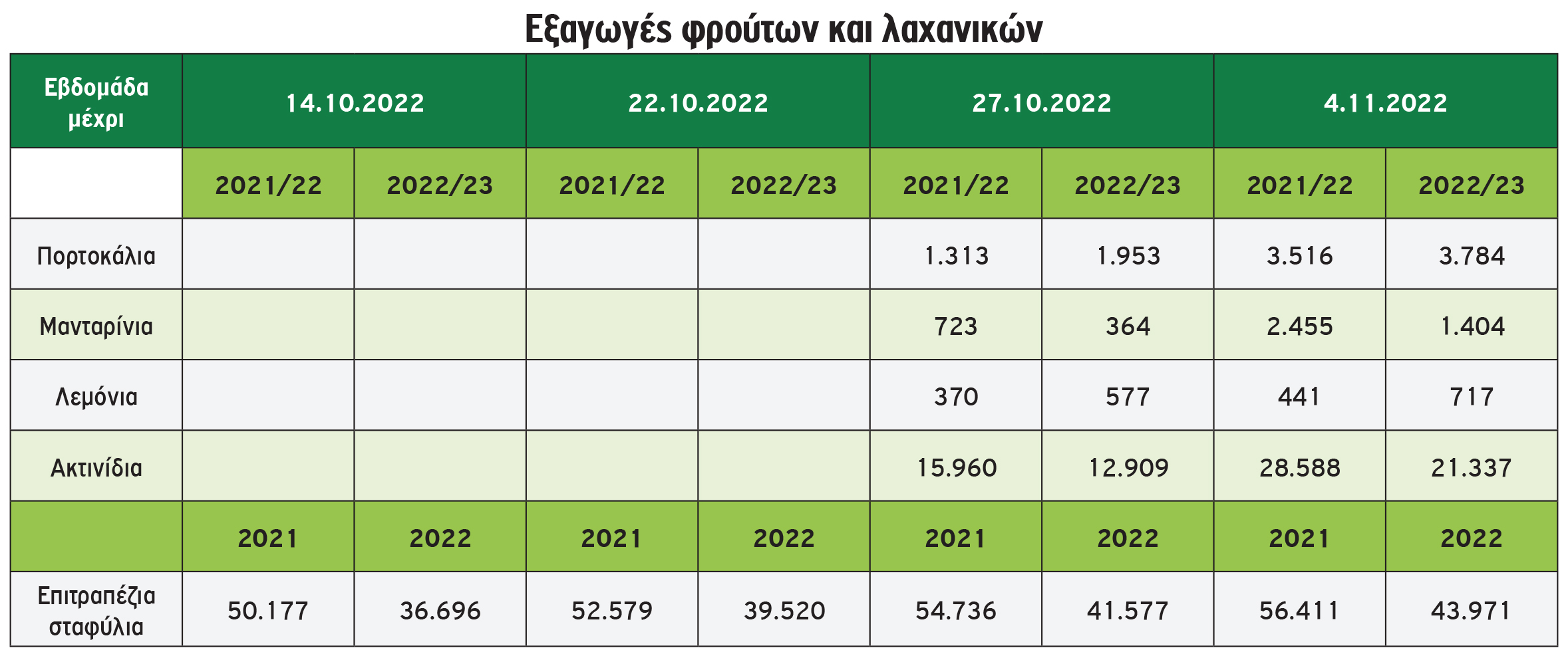 Μιλώντας με αριθμούς, μέχρι τις 4/11/2022 οι εξαγωγές επιτραπέζιων σταφυλιών ανέρχονται σε 43.971 τόνους, μειωμένες κατά 22,1% σε σχέση με το 2021. Η καμπάνια αυτό το διάστημα ολοκληρώνεται και στην περιοχή της Καβάλας μια από τις κύριες περιοχές παραγωγής και εξαγωγής με την μη συγκομιδή όψιμων ένσπερμων ποικιλιών που, όπως φαίνεται,θα μείνουν στους αμπελώνες.