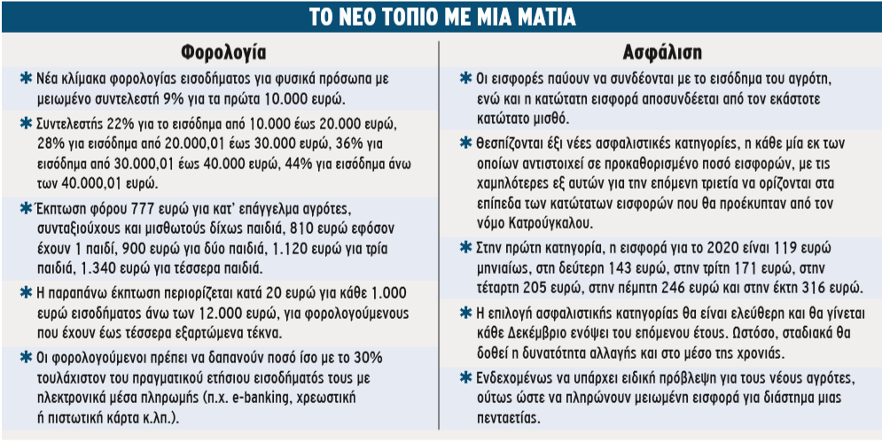 Μια… από τα ίδια, σε επίπεδο φορολογίας εισοδήματος, και μικρές αυξήσεις στο μέτωπο των ασφαλιστικών εισφορών, φέρνει για τη μεγάλη πλειοψηφία των αγροτών η χρονιά που μόλις ξεκίνησε. Στο πεδίο της φορολογίας, η νέα κλίμακα, μαζί με τις αλλαγές στον υπολογισμό της έκπτωσης φόρου (έμμεσο αφορολόγητο), τίθενται μεν σε ισχύ από 1/1/2020, ωστόσο, ο αντίκτυπός τους στα εκκαθαριστικά και, κατ’ επέκταση, στις τσέπες των αγροτών θα φανεί το 2021, τη χρονιά δηλαδή που θα δηλώσουν και θα φορολογηθούν για τα εισοδήματα που θα αποκτήσουν το 2020.