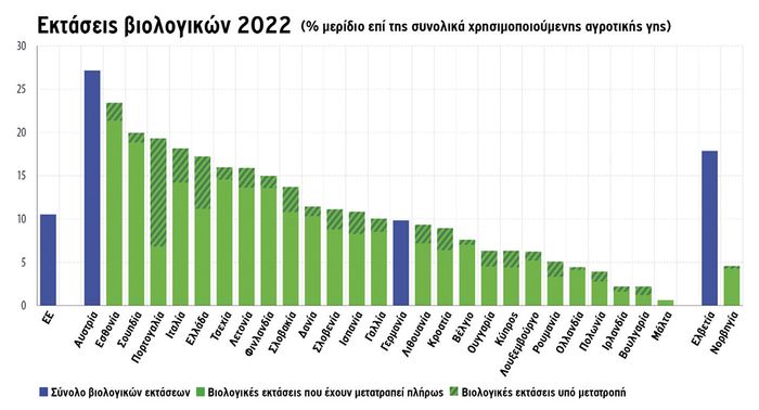 Αν και μακριά ακόμη από τον στόχο του 25% εκτάσεων βιολογικών έως το 2030 –ένα από τα βασικά ζητούμενα για την Κομισιόν–, η ΕΕ έχει καταφέρει να βελτιώσει σημαντικά το ποσοστό των βιολογικών επί του συνόλου των εκτάσεων σε βάθος δεκαετίας (από 5,9% το 2012 σε 10,5% το 2022). Τα υψηλότερα μερίδια εντοπίζονται στις Αυστρία 27%, Εσθονία 23% και Σουηδία 20%, ενώ έντεκα χώρες, συμπεριλαμβανομένης της Ελλάδας, εμφάνιζαν μερίδια άνω του 10% το 2022, με τη χώρα μας να έχει μερίδια βιολογικών της τάξεως του 17,22%. Από την άλλη, υπάρχουν και κράτη με μερίδια κάτω του 5%, με τις Ιρλανδία (2%), Βουλγαρία (2%) και Μάλτα (κάτω του 1%) να κατατάσσονται στις χαμηλότερες θέσεις.