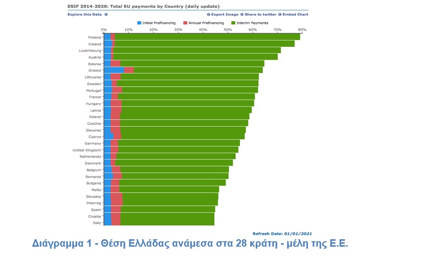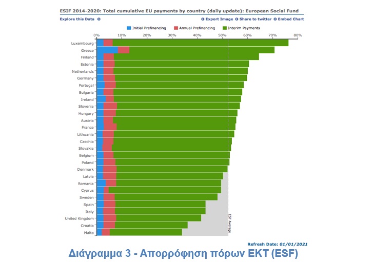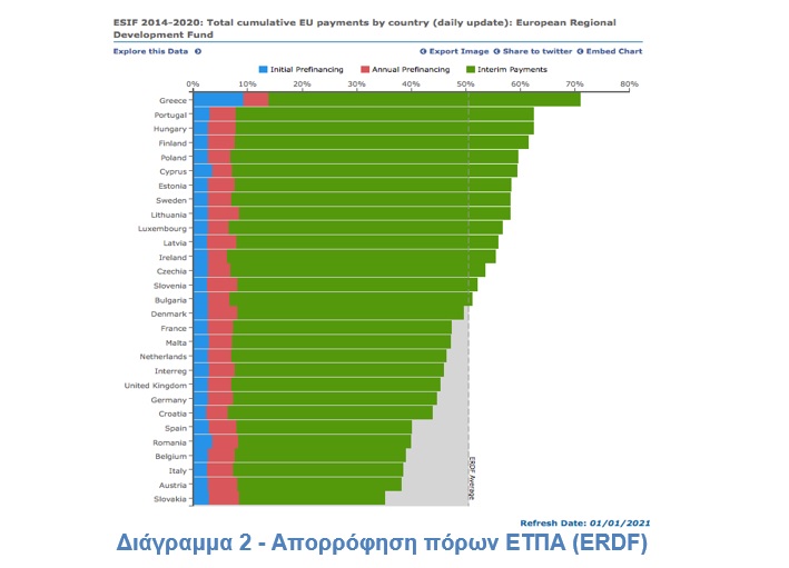 Ειδικότερα, στην απορρόφηση των πόρων του Ευρωπαϊκού Ταμείου Περιφερειακής Ανάπτυξης (ΕΤΠΑ-ERDF) και του Ευρωπαϊκού Κοινωνικού Ταμείου (ΕΚΤ-ESF), η Ελλάδα κατέχει την πρώτη (https://cohesiondata.ec.europa.eu/funds/erdf) και τη δεύτερη θέση (https://cohesiondata.ec.europa.eu/funds/esf), αντίστοιχα, όπως παρουσιάζεται και στα σχετικά διαγράμματα.