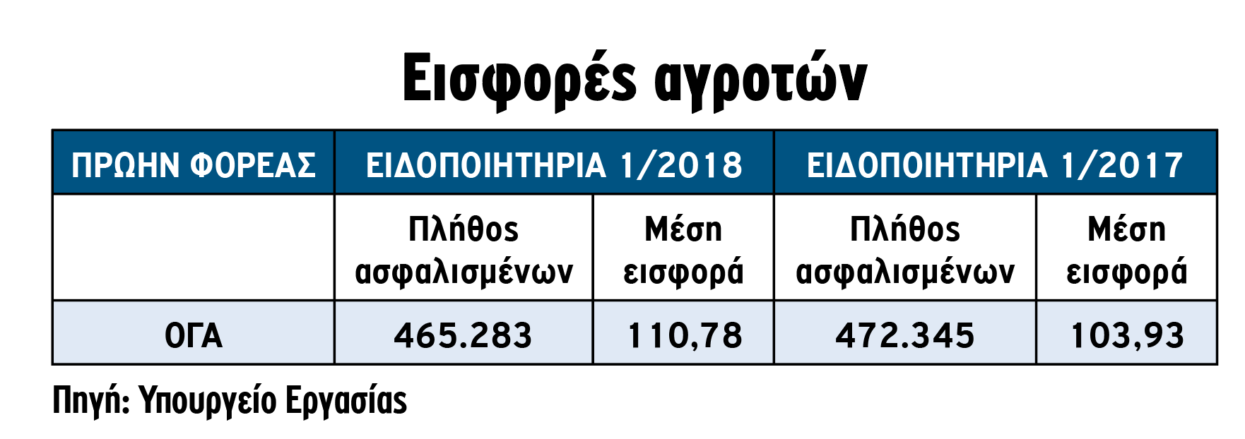 Για τους επαγγελματίες του πρωτογενούς τομέα, οι νέες εισφορές είναι σαφώς αυξημένες σε σχέση με πέρυσι, αφού από 1/1/2018 τέθηκε σε ισχύ ο νέος τρόπος υπολογισμού. Σύμφωνα με αυτόν ως βάση προσδιορισμού των ασφαλιστικών εισφορών λαμβάνεται πλέον υπόψη το άθροισμα του φορολογητέου εισοδήματος από αγροτική δραστηριότητα και των καταβλητέων ασφαλιστικών εισφορών, πολλαπλασιασμένο -ειδικά για το 2018- επί 85% (σ.σ. από το 2019 και μετά, ο υπολογισμός θα γίνεται στο 100%). Εκτός αυτού, αυξημένος στο 23,2% (από 21,2% πέρυσι) είναι από 1/1/2018 και ο συντελεστής των ασφαλίστρων.