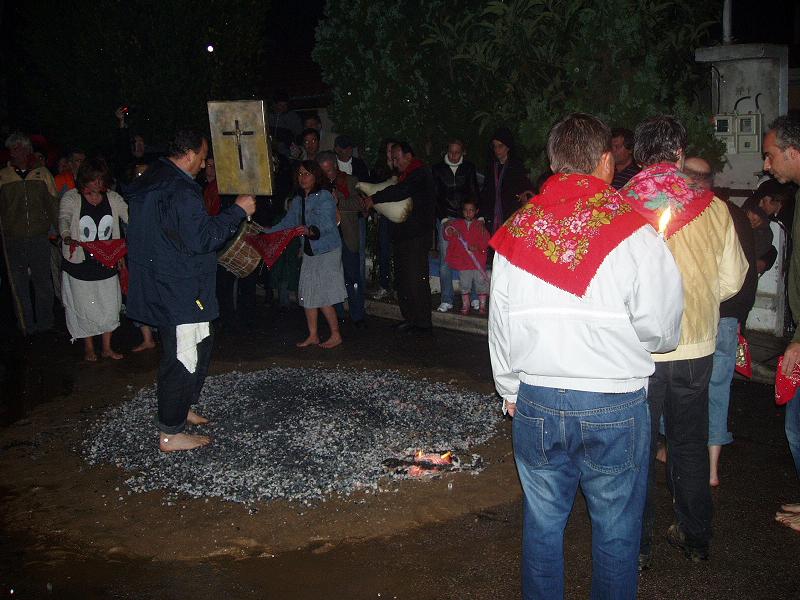 Ο εκστατικός χορός, επαναλαμβάνεται την επόμενη μέρα στο κονάκι, με αυξανόμενη ένταση. Μόλις βραδιάζει, οι αναστενάρηδες χορεύοντας διαρκώς, κατευθύνονται στην πλατεία του χωριού. Εκεί, άλλοι αναστενάρηδες, που έχουν προγονικό το προνόμιο αυτό, μετά από μήνυμα του αρχιαναστενάρη, έχουν ανάψει σωρό από ξύλα, που γρήγορα μεταβάλλονται σε ανθρακιά. Ο χορός με μεγαλύτερη ένταση και πάθος, συνεχίζεται γύρω από την ανθρακιά. Από τον όμιλο των αναστενάρηδων, ξαφνικά ξεχωρίζουν μερικοί άντρες και γυναίκες. Κρατώντας σφιχτά τις εικόνες, προχωρούν προς τα αναμμένα κάρβουνα. Μετά από ένα μικρό δισταγμό, κατευθύνονται με γυμνά πόδια στην ανθρακιά και χορεύουν πάνω στα κάρβουνα. Αυτοί θεωρούνται οι εκλεκτοί που, όπως πιστεύεται, πήραν την εντολή από τον άγιο να πυροβατήσουν τη χρονιά αυτή.Με το τέλος της πυροβασίας, θα επιστρέψουν μαζί με τους άλλους αναστενάρηδες στο κονάκι, όπου θα συνεχίσουν τον χορό.