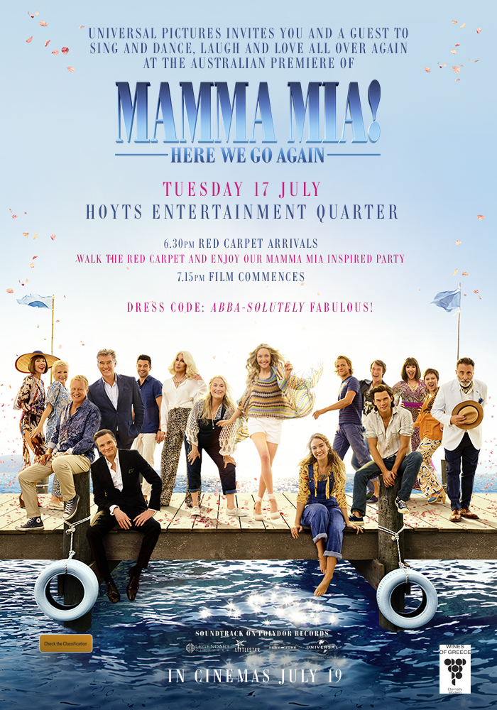 Όπως αναφέρει η διευθύντρια της ΕΔΟΑΟ Μαρία Τριανταφύλλου, η έντονη παρουσία των Wines of Greece στην Αυστραλία αντανακλάται και σε ένα ιδιαίτερο γεγονός, μεγάλης διαφημιστικής προβολής, και συγκεκριμένα στη συνεργασία με τη Universal Pictures, για τη χορηγία σε κρασί, της παγκόσμιας επίσημης πρεμιέρας του film “Mamma Mia! Here we go again” στο Σύδνεϋ στις 17 Ιουλίου. Σημειώνεται ότι η ανταποδοτική χορηγία κρασιού περιλαμβάνει μεταξύ άλλων: