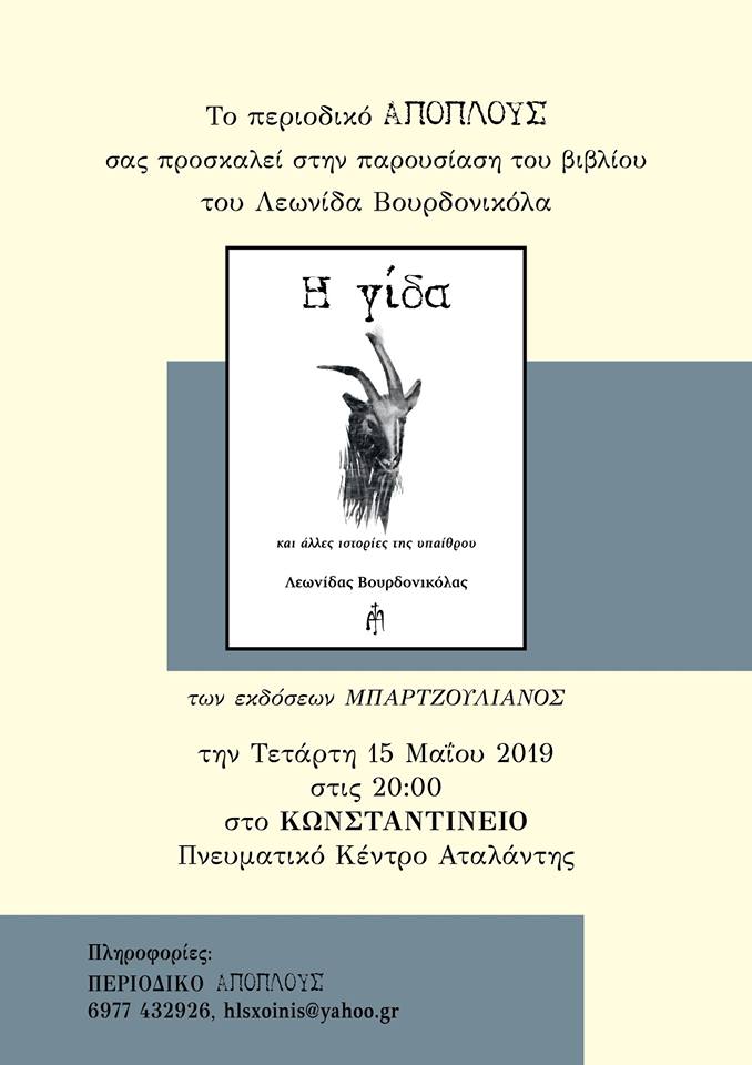 Το βιβλίο διηγημάτων του Λεωνίδα Βουρδονικόλα με τίτλο «Η γίδα και άλλες ιστορίες της υπαίθρου», των εκδόσεων Μπαρτζουλιάνος, παρουσιάζει την Τετάρτη 15 Μαΐου στις 8.00 το βράδυ στο Πνευματικό Κέντρο Κωνσταντίνειο Αταλάντης το περιοδικό «Απόπλους».