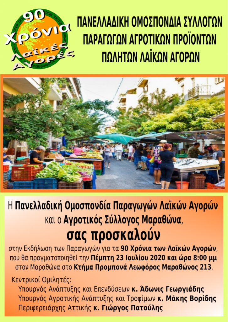 Εκδήλωση για τον εορτασμό των 90 χρόνων των λαϊκών αγορών διοργανώνουν η Πανελλαδική Ομοσπονδία Παραγωγών Λαϊκών Αγορών και ο Αγροτικός Σύλλογος Μαραθώνα την Πέμπτη 23 Ιουλίου 2020 και ώρα 8:00 μμ στον Μαραθώνα.