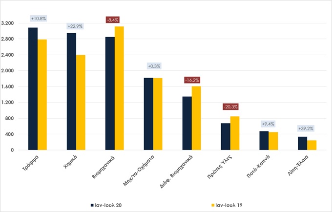 Όσον αφορά στις εξαγωγικές επιδόσεις ανά κλάδο στο α’ επτάμηνο του 2020, η γενική εικόνα παρέμεινε θετική, ωστόσο κλάδοι όπως τα βιομηχανικά και οι πρώτες ύλες κατέγραψαν μεγάλη μείωση εξαγωγών κάνοντας αδήριτη την ανάγκη περαιτέρω υποστήριξής τους. Πιο συγκεκριμένα, την ανοδική τους πορεία συνέχισαν τα τρόφιμα και τα χημικά, καθώς οι δύο κλάδοι σημείωσαν αύξηση εξαγωγών κατά 10,8%, δηλαδή €300,5 εκατ. και 22,9%, δηλαδή €548,3 εκατ. αντίστοιχα.