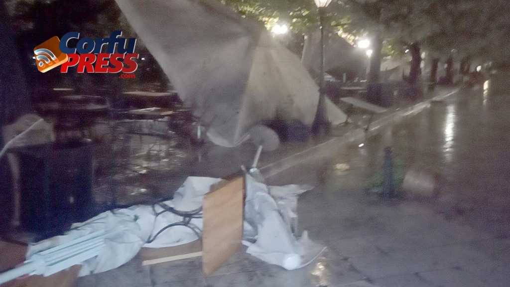 Οι σφοδροί άνεμοι προκάλεσαν καταστροφές στα καταστήματα στο Λιστόν, αφού παρέσυραν ομπρέλες, καθίσματα, ακόμα και κολώνες φωτισμού του Δήμου (!) ενώ συνεργεία του Δήμου, της πολιτικής προστασίας αλλά και περιπολικά βρέθηκαν από την πρώτη στιγμή στις περιοχές που «χτύπησε» ο ανεμοστρόβιλος, ο οποίος συνοδεύτηκε από σφοδρή βροχόπτωση.