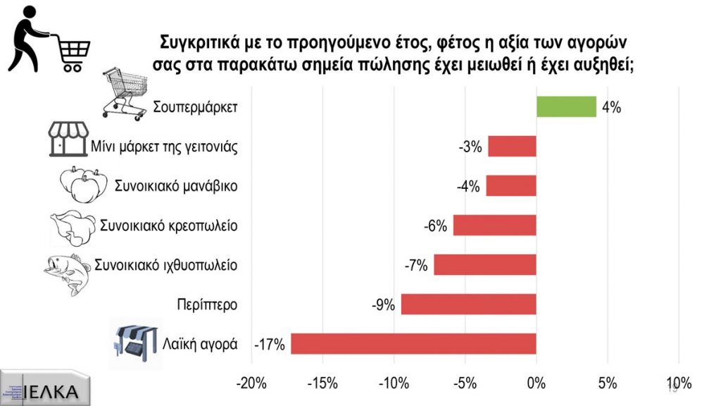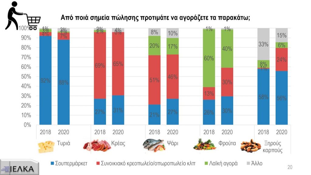 Τα μικρά τοπικά εξειδικευμένα καταστήματα (κρεοπωλεία, ιχθυοπωλεία κ.λπ.) φαίνεται ότι, τηρουμένων των αναλογιών, έχουν καταφέρει να κρατήσουν τις δυνάμεις τους και στις υπόλοιπες κατηγορίες προϊόντων, παρουσιάζοντας κατά περίπτωση είτε μικρές σχετικά απώλειες (π.χ. 65% από 69% στο κρέας και 46% από 51% στο ψάρι), είτε ενισχύοντας από λίγο έως πολύ τα ποσοστά τους (π.χ. 7% από 4% στα τυριά και 24% από 1% στους ξηρούς καρπούς).