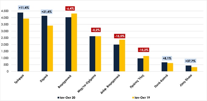 Σε ό,τι αφορά στην εξαγωγική πορεία των επιμέρους κλάδων, τα τρόφιμα και τα χημικά ευθύνονται για τη θετική πορεία των ελληνικών εξαγωγών στο διάστημα Ιανουάριος-Οκτώβριος 2020. Συγκεκριμένα, οι εξαγωγές τροφίμων αυξήθηκαν κατά €448,1 εκατ. δηλαδή 11,4% και ανήλθαν σε €4.377,3 εκατ., ενώ οι εξαγωγές χημικών αυξήθηκαν κατά €731,3 εκατ., δηλαδή 21,4% και διαμορφώθηκαν σε €4.142,9 εκατ. Παράλληλα, αύξηση σημείωσαν οι εξαγωγές ποτών και καπνών (€50,8 εκατ., δηλαδή 8,1%) και οι εξαγωγές λιπών και ελαίων (€121,0 εκατ., δηλαδή 37,7%).