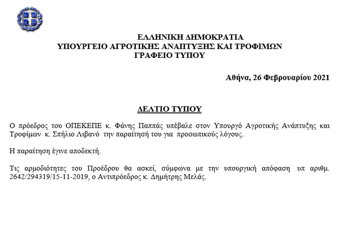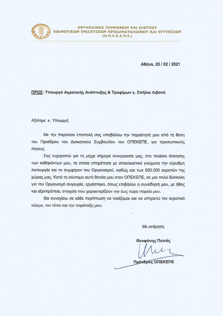 Την παραίτησή του υπέβαλε ο Φ. Παπάς το απόγευμα της Πέμπτης 25/2 με επιστολή του προς τον υπουργό Αγροτικής Ανάπτυξης Σπ. Λιβανό.