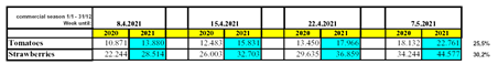 Επίσης συνεχίζεται με αυξητικούς ρυθμούς η εξαγωγή φράουλας και από 1/1 έως 7/5/2021 ανήλθαν σε 44.577 τόνους έναντι 34.244 τ. αντίστοιχα πέρσι.