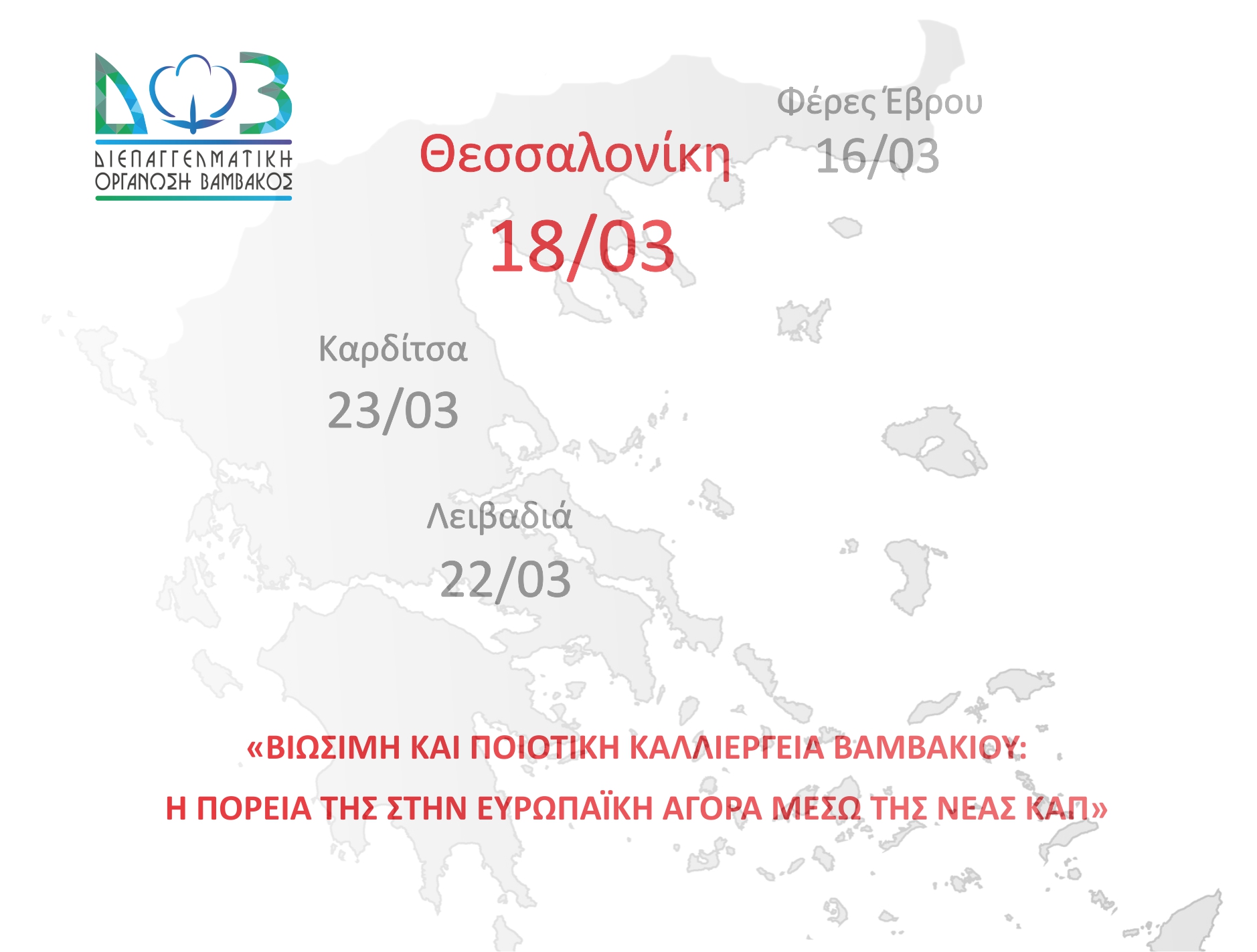 Συνεχίζονται οι ετήσιες εσπερίδες της ΔΟΒ, οι οποίες τιτλοφορούνται: «Βιώσιμη και ποιοτική καλλιέργεια βάμβακος: η πορεία της στην ευρωπαϊκή αγορά μέσω της νέας ΚΑΠ», στα πλαίσια των εκδηλώσεων της Διεπαγγελματικής για την προώθηση του ελληνικού βαμβακιού.