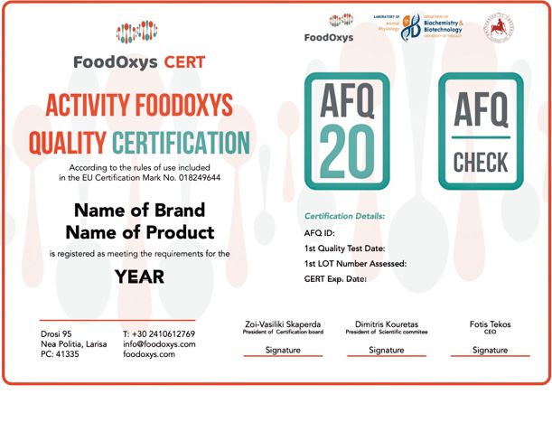 Η spin off του Πανεπιστημίου Θεσσαλίας FoodΟxys, κατανοώντας τη μεγάλη ανάγκη διαφοροποίησης της ελληνικής αγροτικής παραγωγής, δημιούργησε ένα νέο σήμα ποιότητας, το πρώτο σήμα που έχει δημιουργηθεί από την Ελλάδα στα αγροτικά προϊόντα: το AFQ (Activity Foodoxys Quality). Το ευρωπαϊκό σήμα πιστοποίησης AFQ εισάγει ένα νέο πρωτοποριακό σύστημα βαθμολόγησης και κατάταξης της ποιότητας αγροτικών προϊόντων από όλο τον κόσμο.