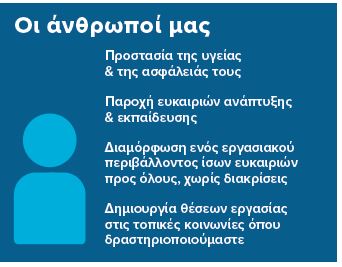 θέτουμε ως βασική προτεραιότητα την υγεία και την ασφάλεια σε ένα ευχάριστο και δημιουργικό εργασιακό περιβάλλον, επενδύοντας καθημερινά στη συνεχή εκπαίδευση και εξέλιξη μέσω δράσεων, όπως: Πιστοποίηση Συστήματος Διαχείρισης Υγείας και Ασφάλειας στην εργασία με το ISO 45001, συνεχείς εκπαιδεύσεις στους εργαζομένους, διαρκής επιδίωξή μας είναι πάντα τα μηδενικά ατυχήματα, κανένα περιστατικό διάκρισης, ανάπτυξη προγραμμάτων υγείας και ευεξίας για τους εργαζομένους, ανάπτυξη της Τράπεζας Αίματος.