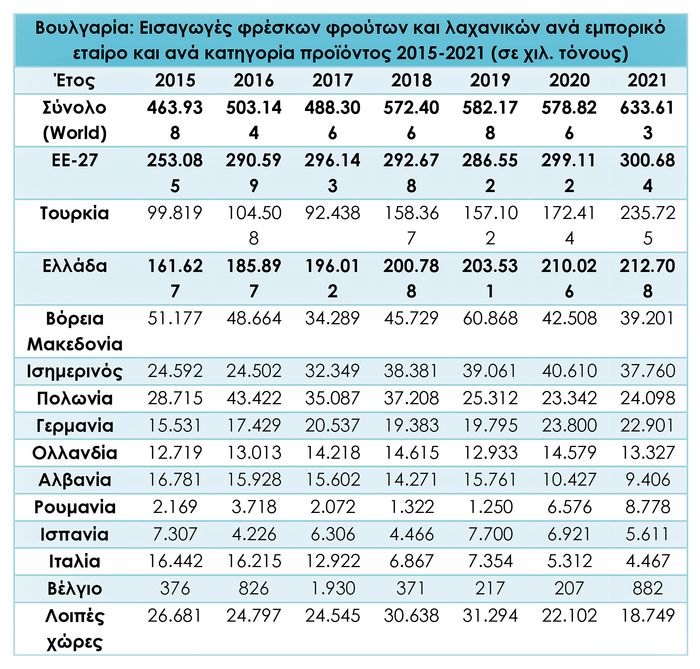 ✱ Τη σημαντική μείωση που καταγράφει η βουλγαρική παραγωγή, προκαλώντας ελλείψεις σε μία ανοδική –λόγω της στροφής σε πιο υγιεινά προϊόντα– αγορά φρέσκων οπωροκηπευτικών, η οποία βασίζεται ολοένα και περισσότερο στις εισαγωγές.
