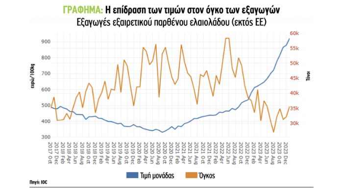 Σε ό,τι αφορά το εμπόριο ελαιολάδου στις κύριες αγορές, το διάστημα Οκτωβρίου 2023-Ιανουαρίου 2024, οι εισαγωγές ελαιολάδου μειώθηκαν κατά 17,7%, ενώ των επιτραπέζιων ελιών αυξήθηκαν κατά 5,4%. Γενικά, οι εισαγωγές μειώθηκαν σε Αυστραλία (-43,9%), Βραζιλία (-33,7%), Καναδά (-15,1%), Κίνα (-70,7%), Ιαπωνία (-32,9%), Ηνωμένες Πολιτείες (-11,3%), ενώ εκτός ΕΕ αυξήθηκαν (+6,8%), σε σύγκριση με την ίδια περίοδο του προηγούμενου έτους.