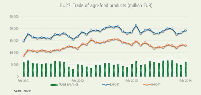 Με τις εισαγωγές να υποχωρούν κατά 2% και τις εξαγωγές να ανεβαίνουν κατά 5% από τον προηγούμενο μήνα, αυξημένο καταγράφηκε τον Φεβρουάριο 2024 το εμπορικό πλεόνασμα των αγροδιατροφικών προϊόντων της ΕΕ, σύμφωνα με τα στοιχεία που δημοσίευσε πρόσφατα η Κομισιόν.