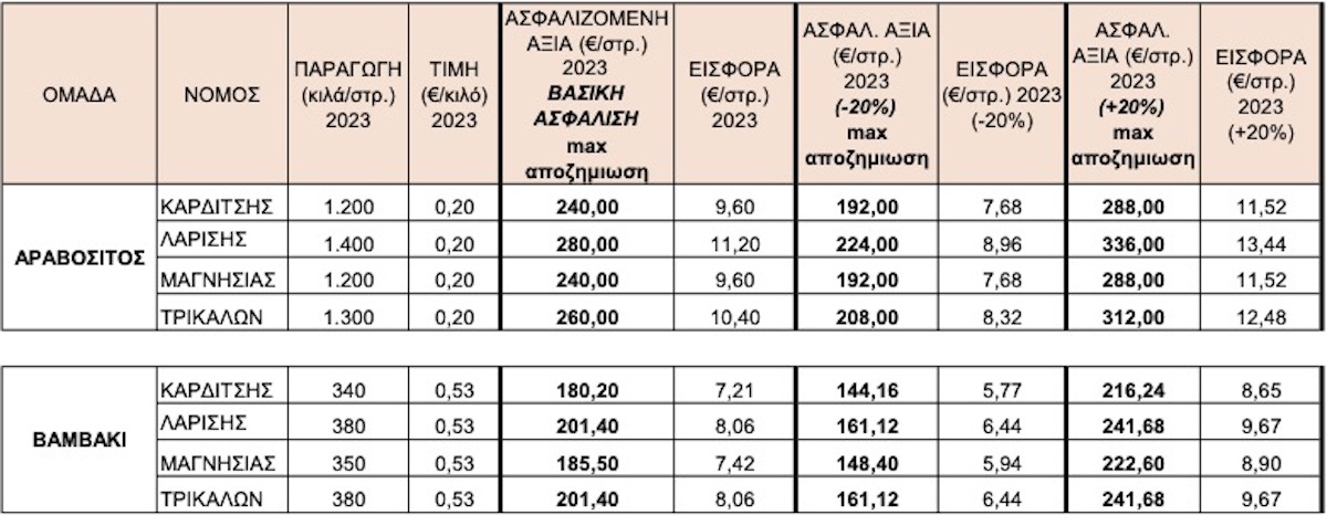 Οι παραγωγοί βάμβακος, οι οποίοι ασφάλιζαν την παραγωγή τους επαυξημένη κατά 20% κατέβαλαν 8,65 ευρώ ανά στρέμμα, στα 100 στρέμματα καλλιέργειας πλήρωσαν 865 ευρώ και η ασφαλιζόμενη αξία ανέρχεται στα 21.624 ευρώ για τα 100 στρέμματα.