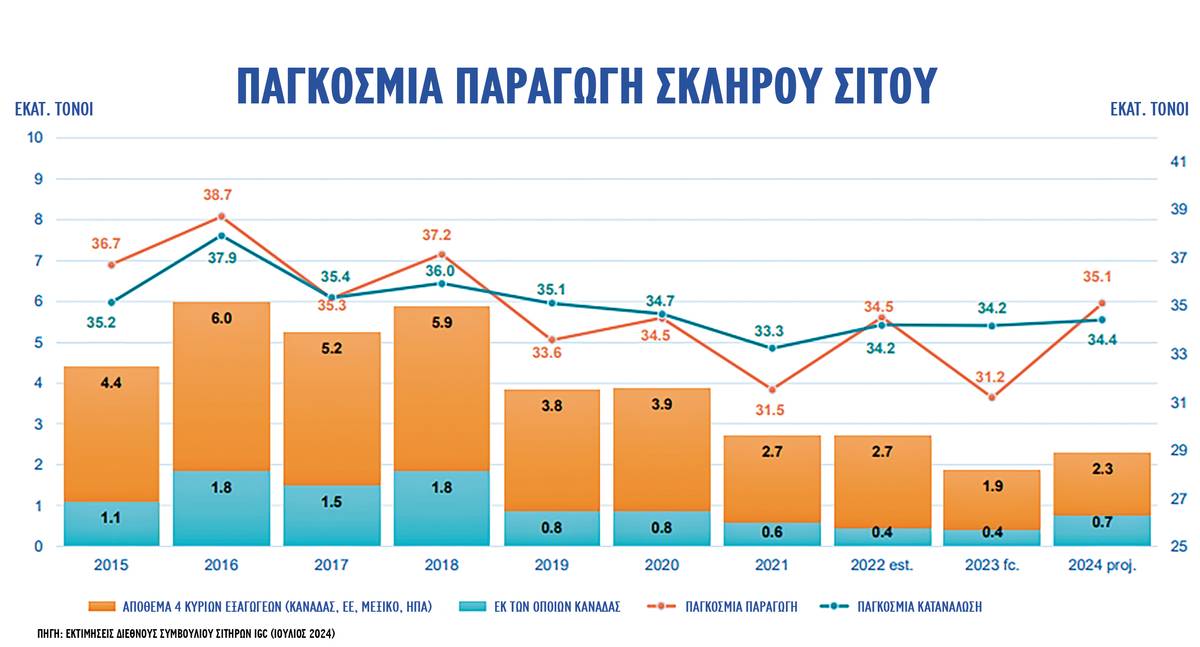 Με την παγκόσμια παραγωγή να εκτιμάται ότι θα ανέλθει στους 35,1 εκατ. τόνους το 2024-2025, αύξηση κατά 53,3% προβλέπεται για τον Καναδά και κατά 50,5% για τις ΗΠΑ. Οι δύο αυτές παραγωγικές χώρες αντισταθμίζουν εν μέρει τη μείωση που προβλέπεται για την ΕΕ (-6%), ενώ μείωση αναφέρεται και για την παραγωγή του Μεξικού, κατά 19,9% σε ετήσια βάση. Από την άλλη, άνοδο της τάξεως του 4,7% προβλέπεται για την παραγωγή της Τουρκίας. Οι προβλέψεις αυτές προκύπτουν από πρόσφατη ανάλυση της Κομισιόν, βασισμένη σε στοιχεία του Διεθνούς Συμβουλίου Σιτηρών.