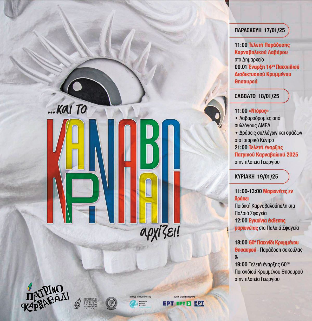 Οι δράσεις θα συνεχιστούν και την Κυριακή 19 Ιανουαρίου, με έντονη την παρουσία του Καρναβαλιού των Μικρών και του 60ού Παιχνιδιού του Κρυμμένου Θησαυρού. Αξίζει να σημειώσουμε ότι το ιστορικό παιχνίδι, που φέτος φτάνει στην 60ή του διοργάνωση, θα έχει τη δική του τελετή έναρξης στην Πλατεία Γεωργίου Α΄ την Κυριακή 19 Ιανουαρίου, στις 07.00 μ.μ. Μαζί, η παράδοση σακούλας στα πληρώματα και μια πρόγευση από τα πολλά και συναρπαστικά που θα ακολουθήσουν στην ιδιαίτερη και επετειακή αυτή χρονιά.