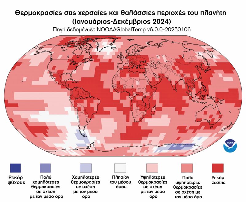 Στο ίδιο συμπέρασμα κατέληξαν και οι επιστήμονες της Εθνικής Υπηρεσίας Περιβαλλοντικής Ενημέρωσης των ΗΠΑ (NCEI), η οποία υπάγεται στην Εθνική Διεύθυνση Ωκεανών και Ατμόσφαιρας (NOAA) της χώρας. Σχεδίασαν, επίσης, έναν παγκόσμιο χάρτη (βλ. γράφημα χάρτη) με έγχρωμα τετράγωνα, στα οποία απεικονίζεται τμηματικά η μέση θερμοκρασίας της γης και των ωκεανών για ολόκληρο το έτος 2024. Οι χρωματικές διακυμάνσεις των τετραγώνων αποτυπώνουν τις κατά τόπους συνθήκες, εκτεινόμενες από ρεκόρ κρύου (σκούρο μπλε) έως ρεκόρ ζέστης (σκούρο κόκκινο). Όπως παρατηρούμε, η Ελλάδα είναι μεταξύ των περιοχών που βρέθηκαν στο… σκούρο κόκκινο, ενώ γενικότερα ο πλανήτης… βράζει!