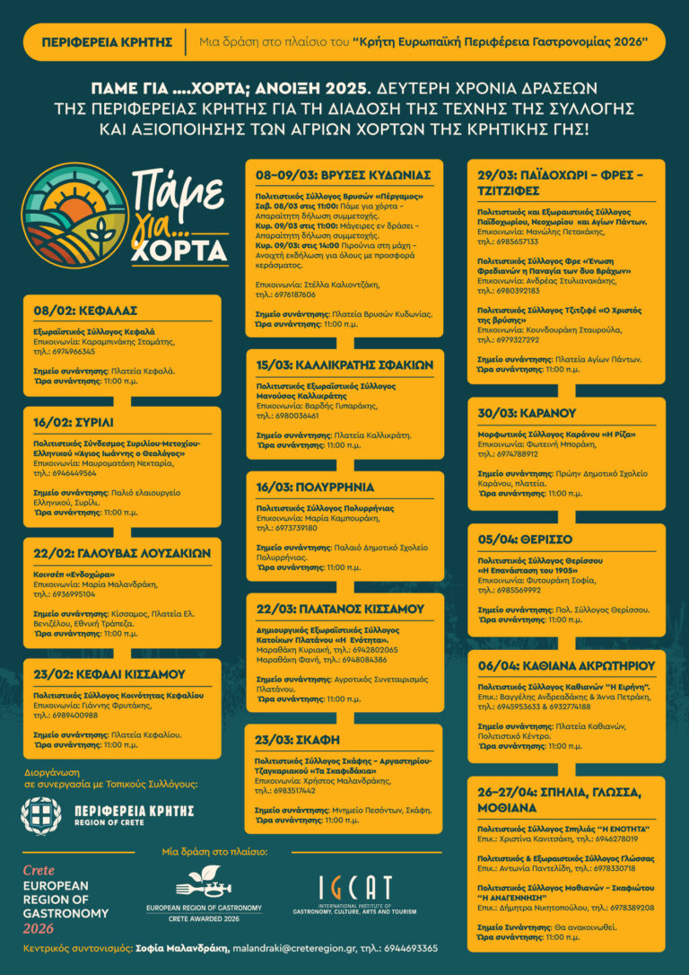 Η Περιφέρεια Κρήτης-Περιφερειακή Ενότητα Χανίων σε συνεργασία με Τοπικούς Συλλόγους αναγνωρίζοντας την αξία των άγριων, βρώσιμων χόρτων, διοργανώνει πρόγραμμα δράσεων σε όλο το εύρος της Π.Ε Χανίων, για τη διάδοση της Τέχνης της Συλλογής και Αξιοποίησης των Άγριων Χόρτων της Κρητικής Γης.