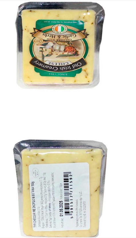 Συγκεκριμένα πρόκειται για τυριά με ονομασίες πώλησης “Cheddar with Garlic & Herbs” και “Old Irish Creamery Cheese Irish Cheddar with Red Wine”, σε συσκευασίες των 150g και 1,2kg αντίστοιχα, με ημερομηνίες ανάλωσης κατά προτίμηση πριν από 01/05/2025.
