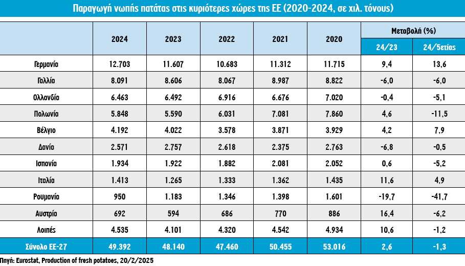 Η αύξηση της παραγωγής νωπής πατάτας ήταν ιδιαίτερα αισθητή στην Αυστρία και την Ιταλία (+16,4% και +11,6% αντίστοιχα) και σε μικρότερο βαθμό σε ορισμένες άλλες χώρες (Γερμανία, Πολωνία, Βέλγιο). Αντίθετα, αισθητή μείωση καταγράφεται στη Γαλλία, τη δεύτερη σημαντικότερη παραγωγό χώρα της ΕΕ, ενώ ακόμα μεγαλύτερη ήταν η πτώση στη Ρουμανία. Γενικότερα, πάντως, η παραγωγή του προϊόντος παρουσιάζει υψηλό βαθμό συγκέντρωσης στην ΕΕ, μια και πέντε χώρες (Γερμανία, Γαλλία, Ολλανδία, Πολωνία και Βέλγιο) κάλυψαν εκ νέου το μεγαλύτερο μέρος (76% του όγκου).