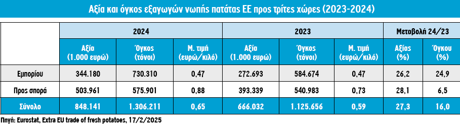 Στο εμπόριο νωπής πατάτας με τρίτες χώρες η ΕΕ παραμένει καθαρά πλεονασματική επί σειρά ετών. Στο σύνολό τους, οι εξαγωγές του προϊόντος ανήλθαν το 2024 σε 1,3 εκατ. τόνους, αξίας 848 χιλ. ευρώ, παρουσιάζοντας ως προς το προηγούμενο έτος σημαντική άνοδο στον όγκο και την αξία (+16% και +27% αντίστοιχα).