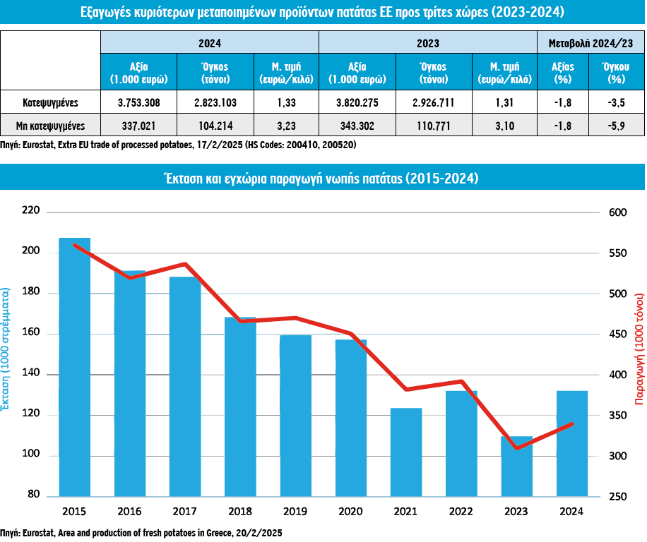 Το 2024 μικρότερος όγκος νωπής πατάτας οδηγήθηκε στη μεταποίηση, με συνέπεια τον περιορισμό των εξαγωγών της ΕΕ σε κατεψυγμένα προϊόντα, ο όγκος των οποίων εκτιμάται σε 2,82 εκατ. τόνους, αξίας 3,75 δισ. ευρώ, παρουσιάζοντας μείωση ως προς το προηγούμενο έτος στον όγκο (-3,5%) και μικρότερη στην αξία (-1,8%) λόγω της αύξησης της μέσης τιμής εξαγωγής (1,33 ευρώ/κιλό).