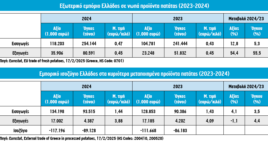 Πέραν αυτών, όμως, σε εξαιρετικά υψηλό επίπεδο βρίσκεται το έλλειμμα εμπορικού ισοζυγίου της χώρας στα κυριότερα μεταποιημένα προϊόντα πατάτας, με τις εισαγωγές (93,5 χιλ. τόνοι, αξίας άνω των 134 εκατ. ευρώ το 2024) να παραμένουν πολλαπλάσιες των εξαγωγών (4,4 χιλ. τόνοι, αξίας 17 εκατ. ετών).
