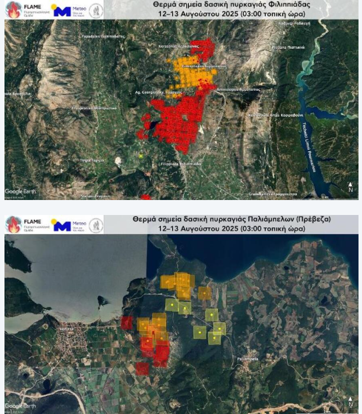 Το πρώτο μέτωπο κινείται προς τους οικισμούς Ριζοβούνι και Ρωμιά και το δεύτερο προς τους οικισμούς Δρυόφυτο και Παντάνασσα. Και τα δύο μέτωπα έχουν κατεύθυνση προς Φιλιππιάδα, ενώ για την αεροπυρόσβεση έχουν διατεθεί 5 αεροσκάφη και 2 ελικόπτερα.
