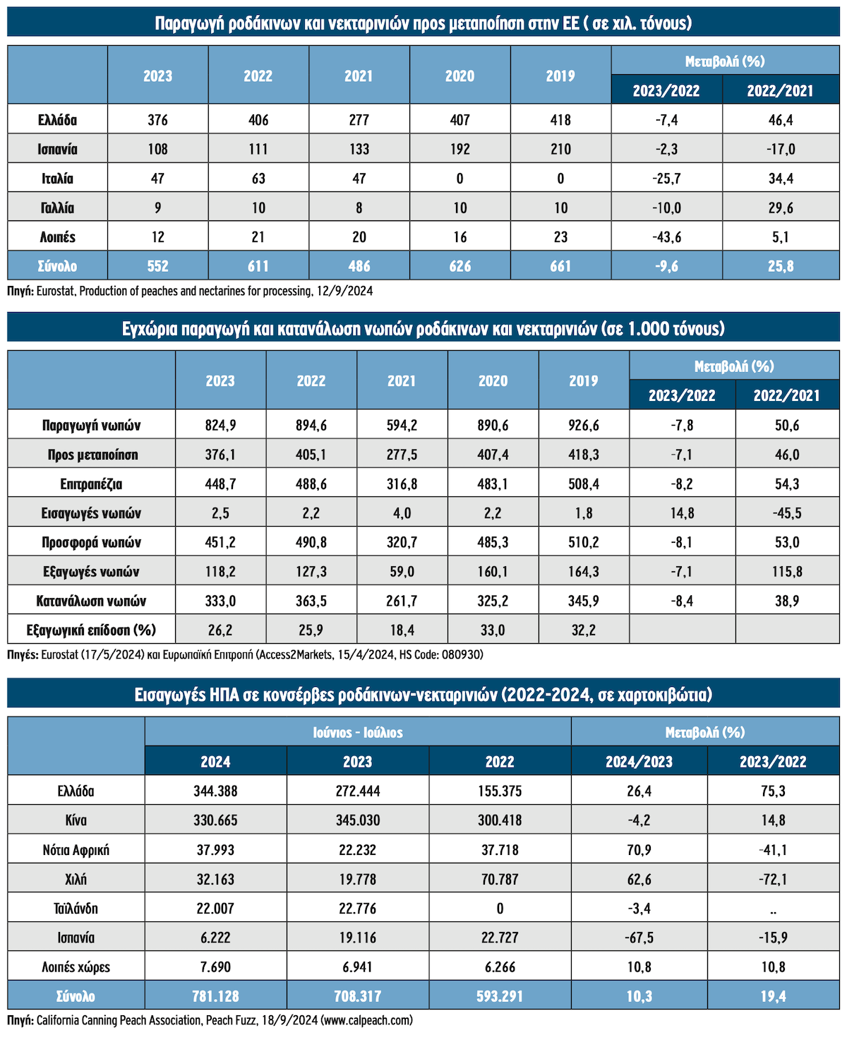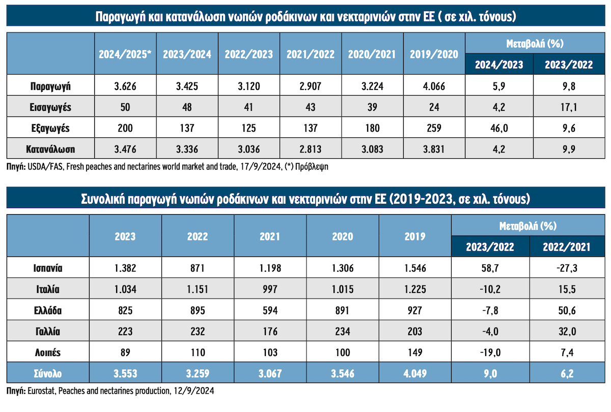 Στην Ελλάδα, η συνολική παραγωγή ροδάκινων και νεκταρινιών, μετά τη σημαντική μείωσή της κατά το προηγούμενο έτος (-7,8%), αναμένεται να ανακάμψει το 2024, κυμαινόμενη σε 860 χιλ. τόνους (+4%), παρουσιάζοντας αισθητή άνοδο στα επιτραπέζια προϊόντα (+8%), ενώ στα προς μεταποίηση προϊόντα προβλέπεται στασιμότητα, με όγκο σχεδόν παρόμοιο με εκείνον του 2023.