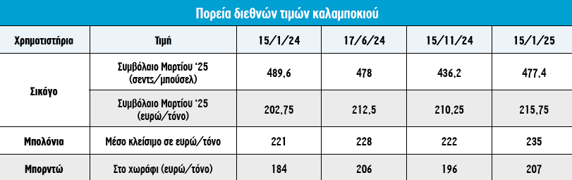 Ενδεικτικά να αναφέρουμε ότι από τις 8 έως τις 15 Ιανουαρίου το συμβόλαιο καλαμποκιού του Μαρτίου ’25 αυξήθηκε από τα 453,6 σεντς/μπούσελ σε 477,2 σεντς/μπούσελ. Παρόμοια αύξηση είχαμε και στα ευρωπαϊκά συμβόλαια. Πάντως, τη Δευτέρα έφτασαν στα υψηλότερα επίπεδα εδώ και λίγο περισσότερο από έναν χρόνο. Στο Χρηματιστήριο Euronext, η τιμή του συμβολαίου του Μαρτίου ’25 αυξήθηκε από τα 211,25 ευρώ/τόνο στις 8 Ιανουαρίου στα 215,75 ευρώ/τόνο στις 15 Ιανουαρίου.