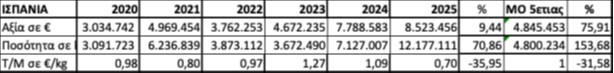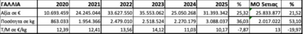 Αποτέλεσμα της συνεχιζόμενης ανόδου των εισαγωγών ήταν και το ότι για δεύτερη χρονιά στα χρονικά οι εισαγωγές σε ποσότητα το 2025 (30.291.109 kg) υπερσκέλισαν τις αντίστοιχες εξαγωγές (28.201.726 kg).