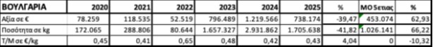 Να τονισθεί ότι η μέση τιμή μονάδος εισαγωγής το 2025, δείχνει μειωμένη σε σύγκριση με το μέσο όρο 5ετίας κατά 10,37%, γεγονός που υποδηλώνει ότι την τελευταία 5ετία οι τιμές εισαγωγής από Βουλγαρία μειώνονται.