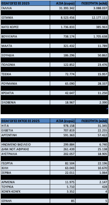 Η Γαλλία επιστρέφει στην πρώτη θέση ως χώρα ενδοκοινοτικής απόκτησης οίνων από την Ελλάδα το 2025 σε αξία αλλά κατατάσσεται τρίτη σε ποσότητα. Το 2025 καταγράφει αλματώδη αύξηση σε αξία των παραδόσεων οίνων στην Ελλάδα κατά 25,32% (25.050.258 €/2024 – 31.393.342 €/2025). Αύξηση (21,52%) καταγράφεται επίσης, συγκρίνοντας τον μέσο όρο 5ετίας με το 2025.
