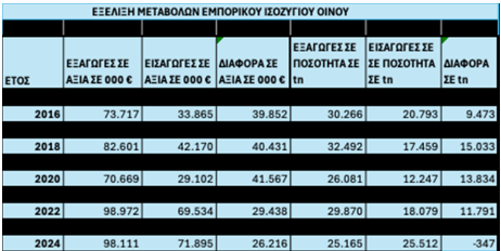 Τέλος πρέπει να επισημανθεί ότι η εικόνα του εμπορικού ισοζυγίου οίνου βαίνει μειούμενη ως προς το θετικό του πρόσημο σε αξία, ενώ για δεύτερη φορά το 2025 εξελίσσεται με αρνητικό πρόσημο ως προς την ποσότητα, σύμφωνα με τον πίνακα που ακολουθεί: