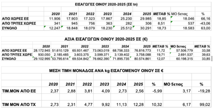 Σημαντική είναι και η αύξηση της μέσης τιμής εισαγόμενων οίνων από Τρίτες Χώρες κατά 10,32% το 2025 έναντι του 2024 (12,28 €/kg-2025 – 11,13 €/kg-2024).