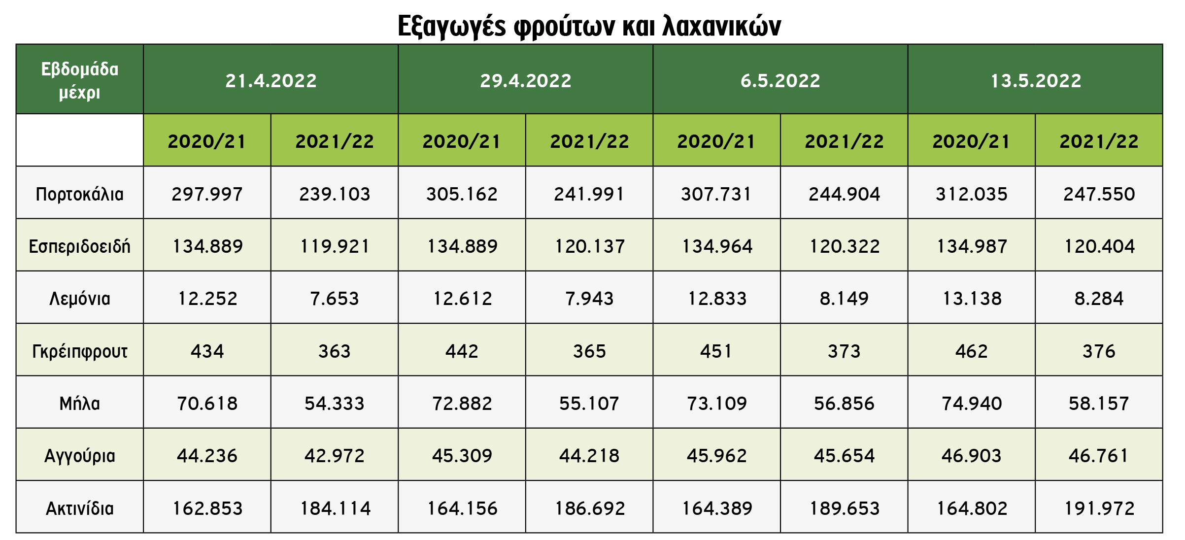 Οι ροές των εξαγωγών μας μέχρι 13/5/2022 παρουσιάζει μείωση έναντι της αντίστοιχης περσινής της τάξης του -9.9%,